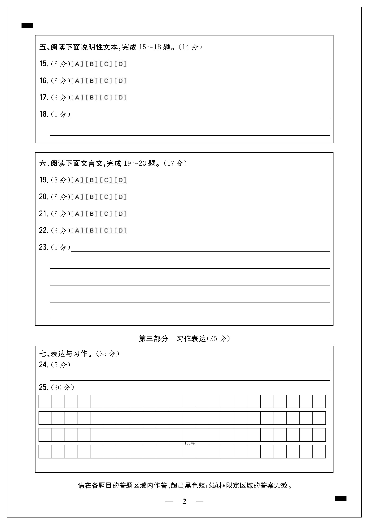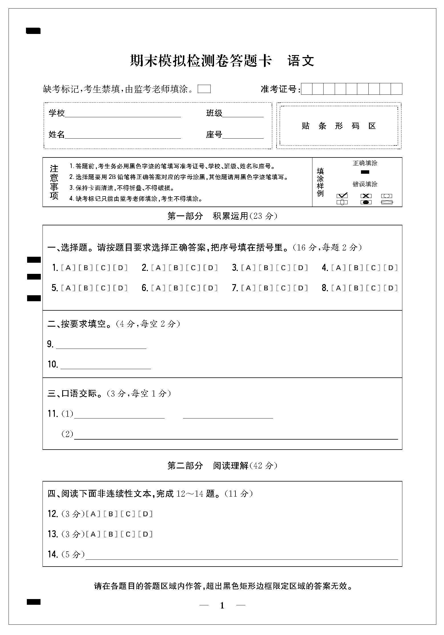期末模拟检测卷答题卡21