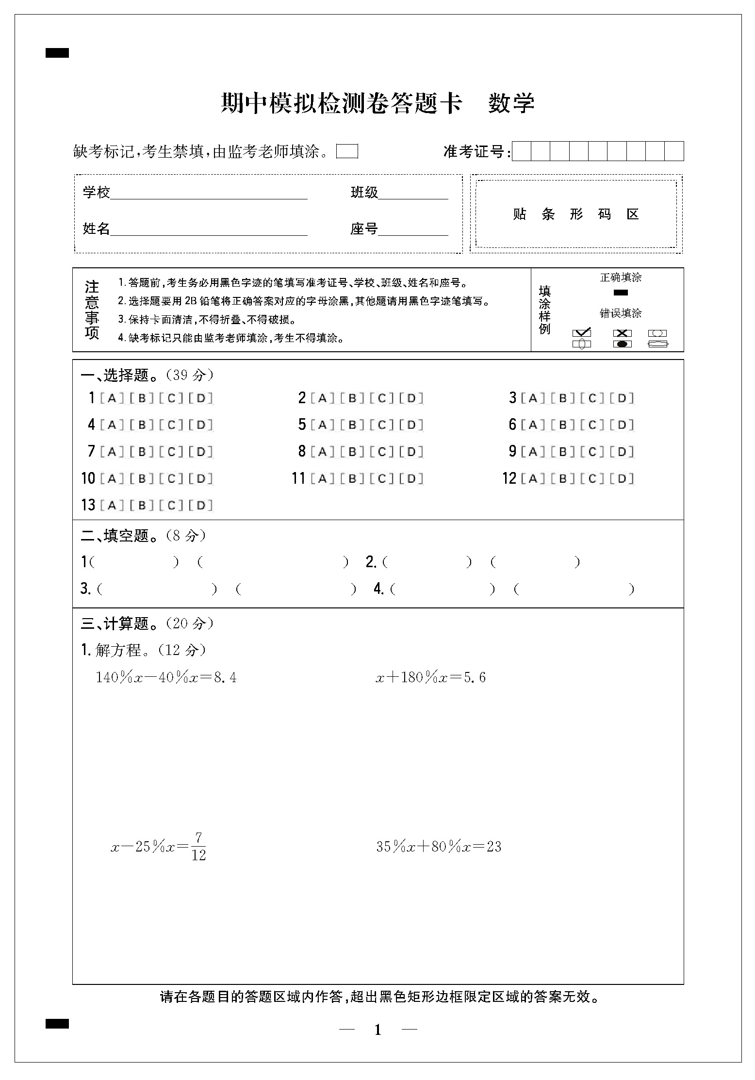 期中模拟检测卷答题卡21