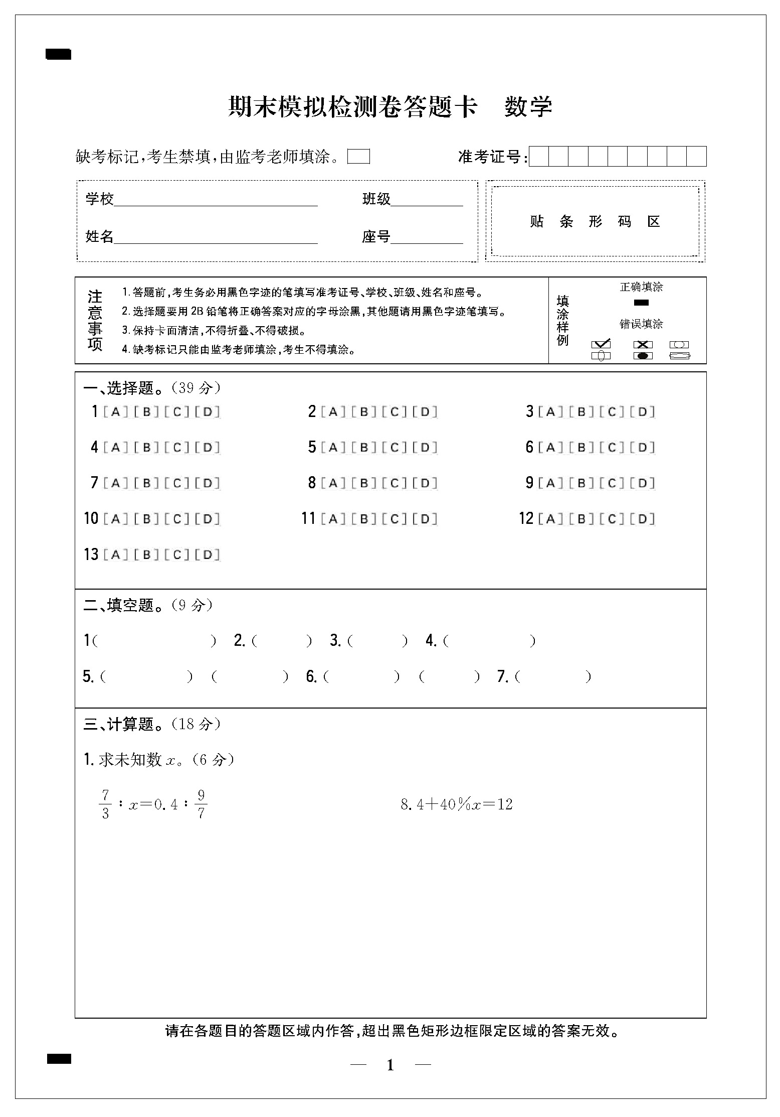 期末模拟检测卷答题卡21
