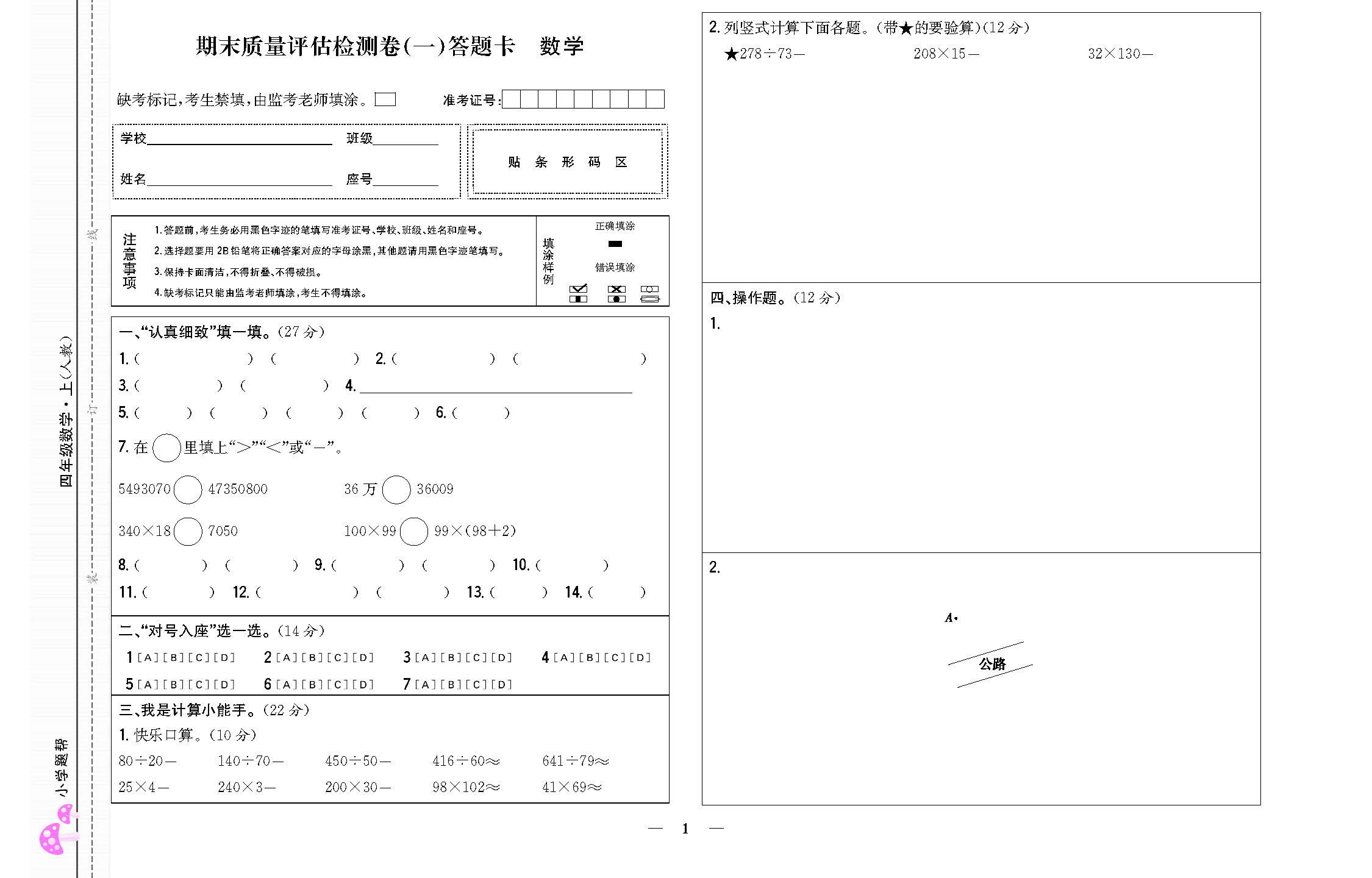 题帮数学人4上答题卡