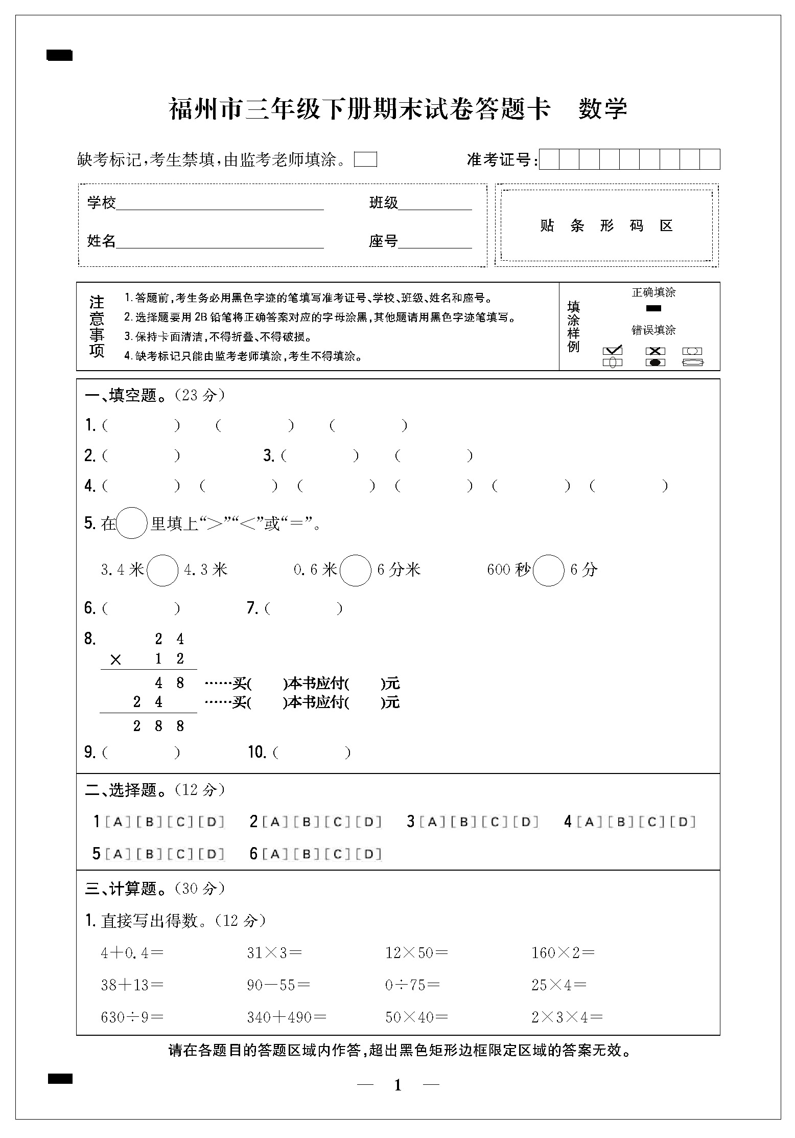 福州市三年级下册期末试卷答题卡21