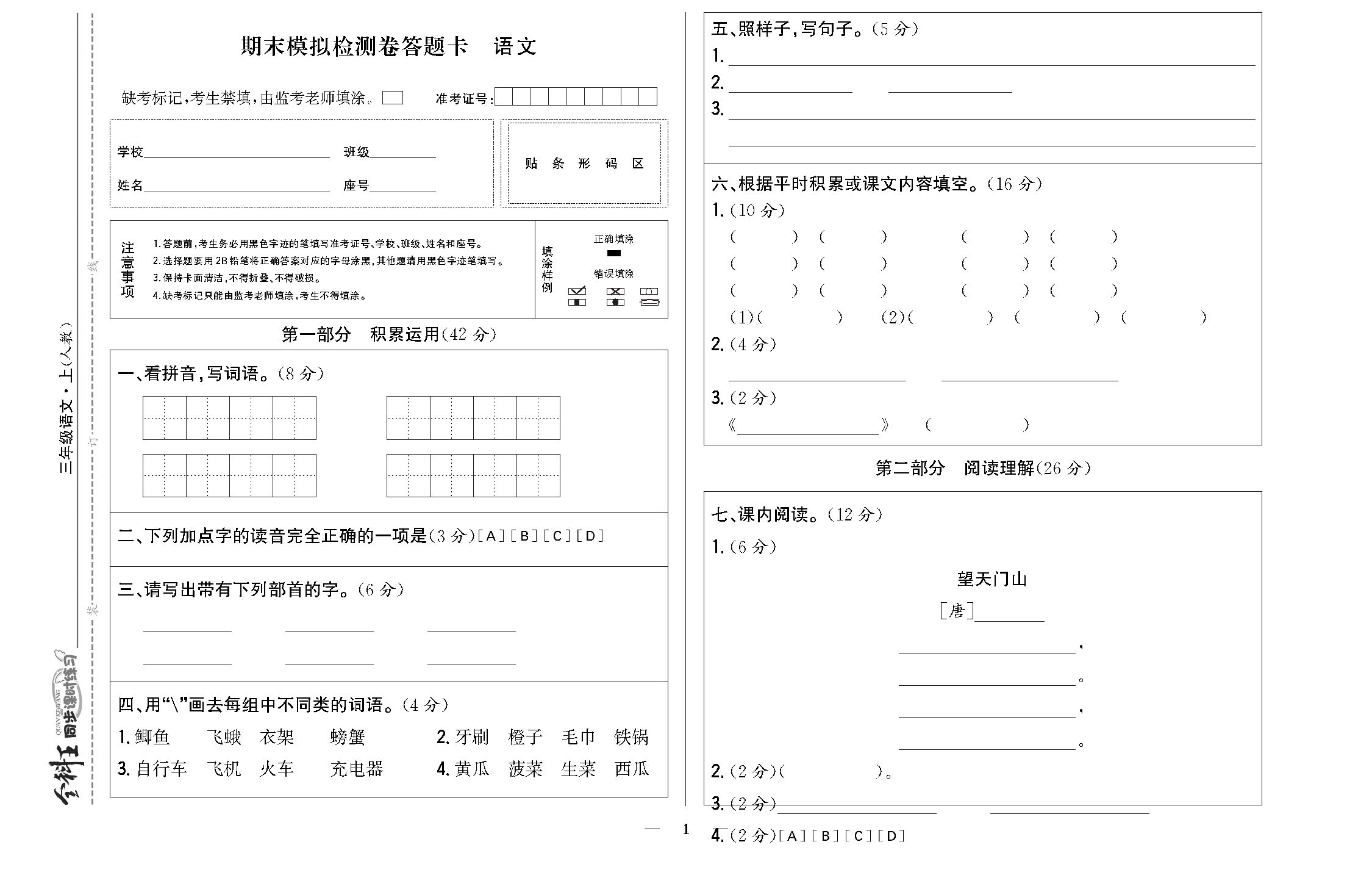 期末模拟检测卷 答题卡220408