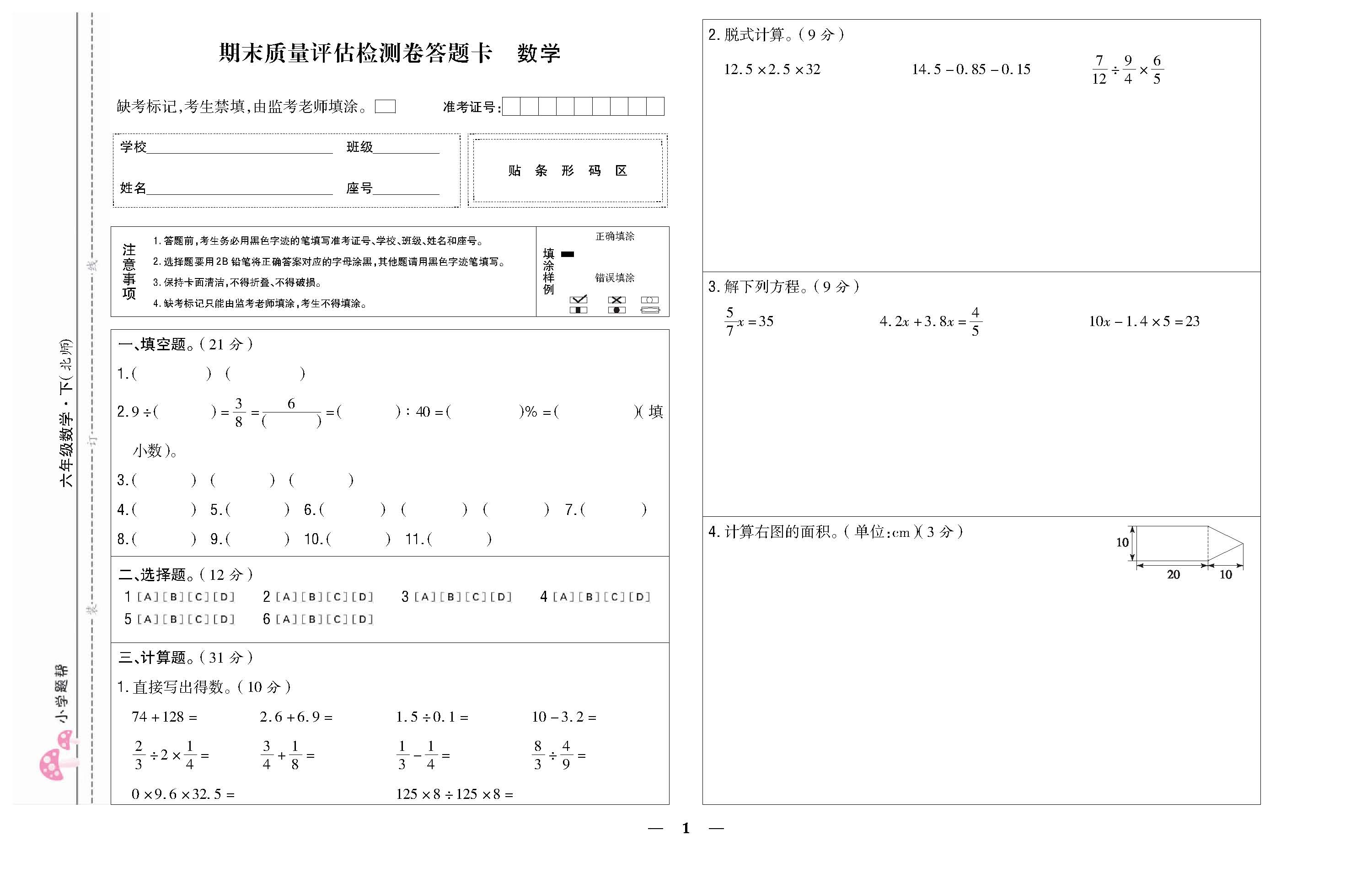 期末质量评估检测卷 答题卡220705