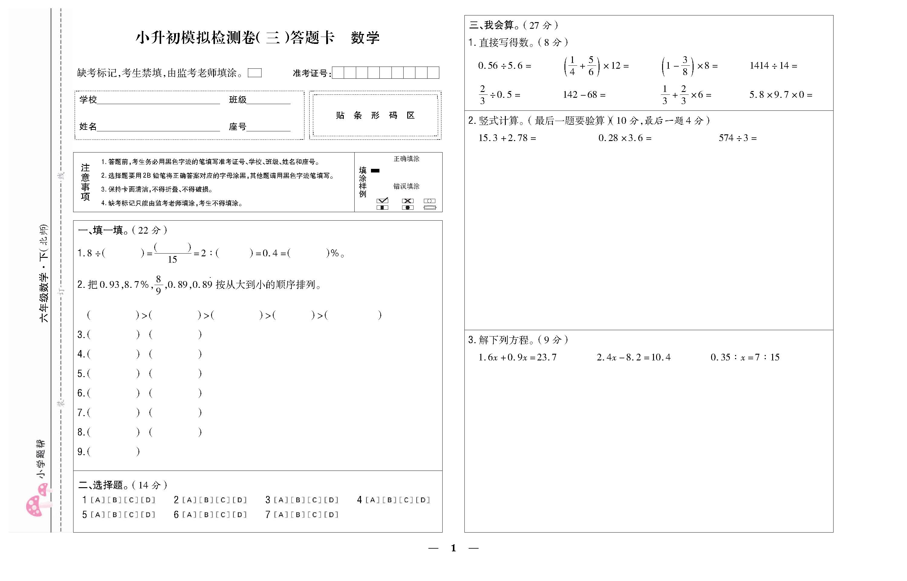 小升初模拟检测卷(三)答题卡220705