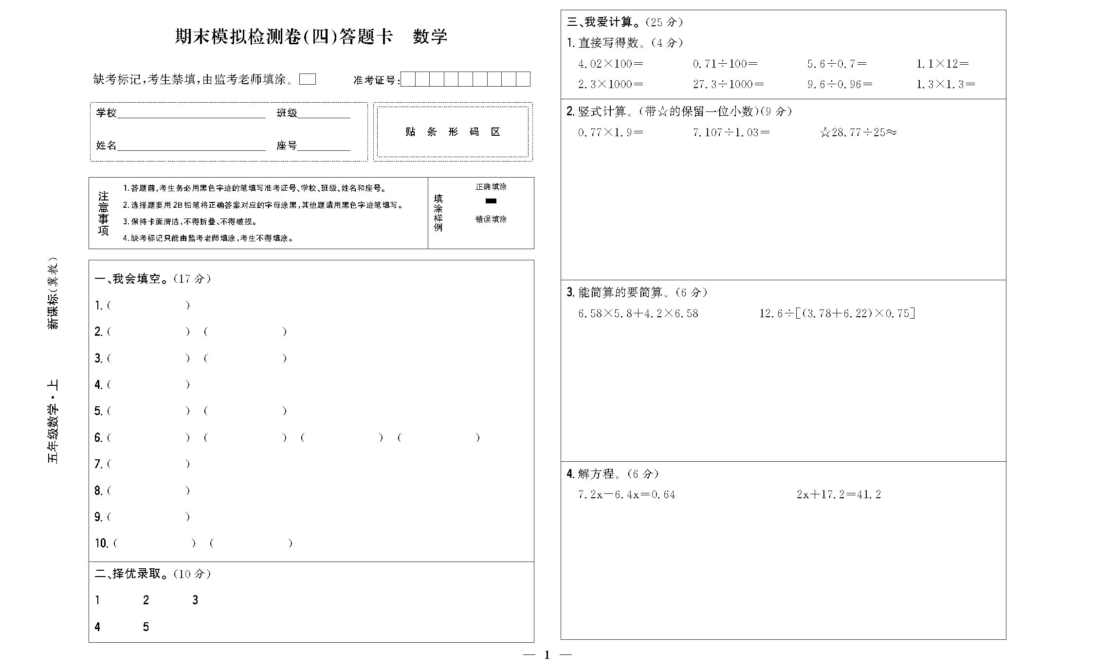 期末模拟检测卷(四)答题卡220712