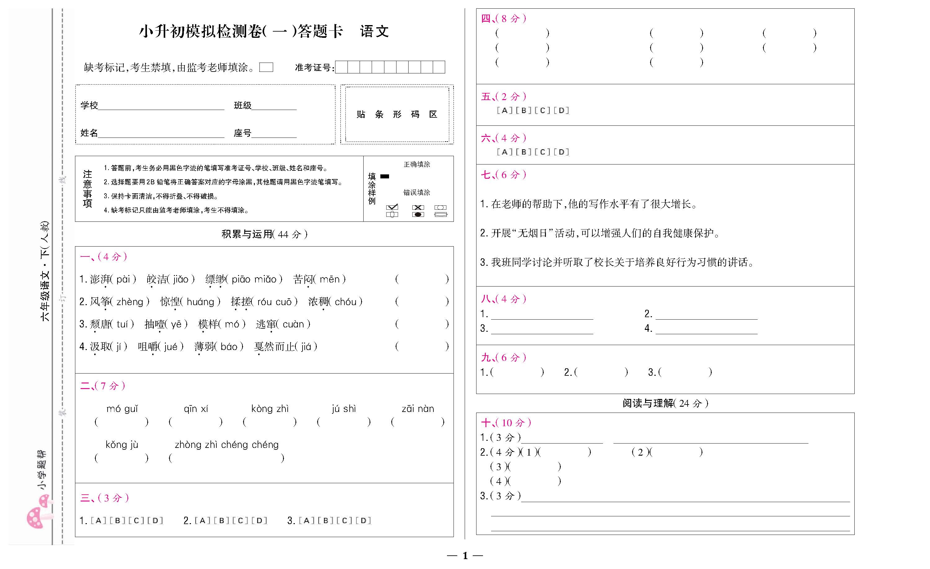小升初模拟检测卷(一)答题卡220817
