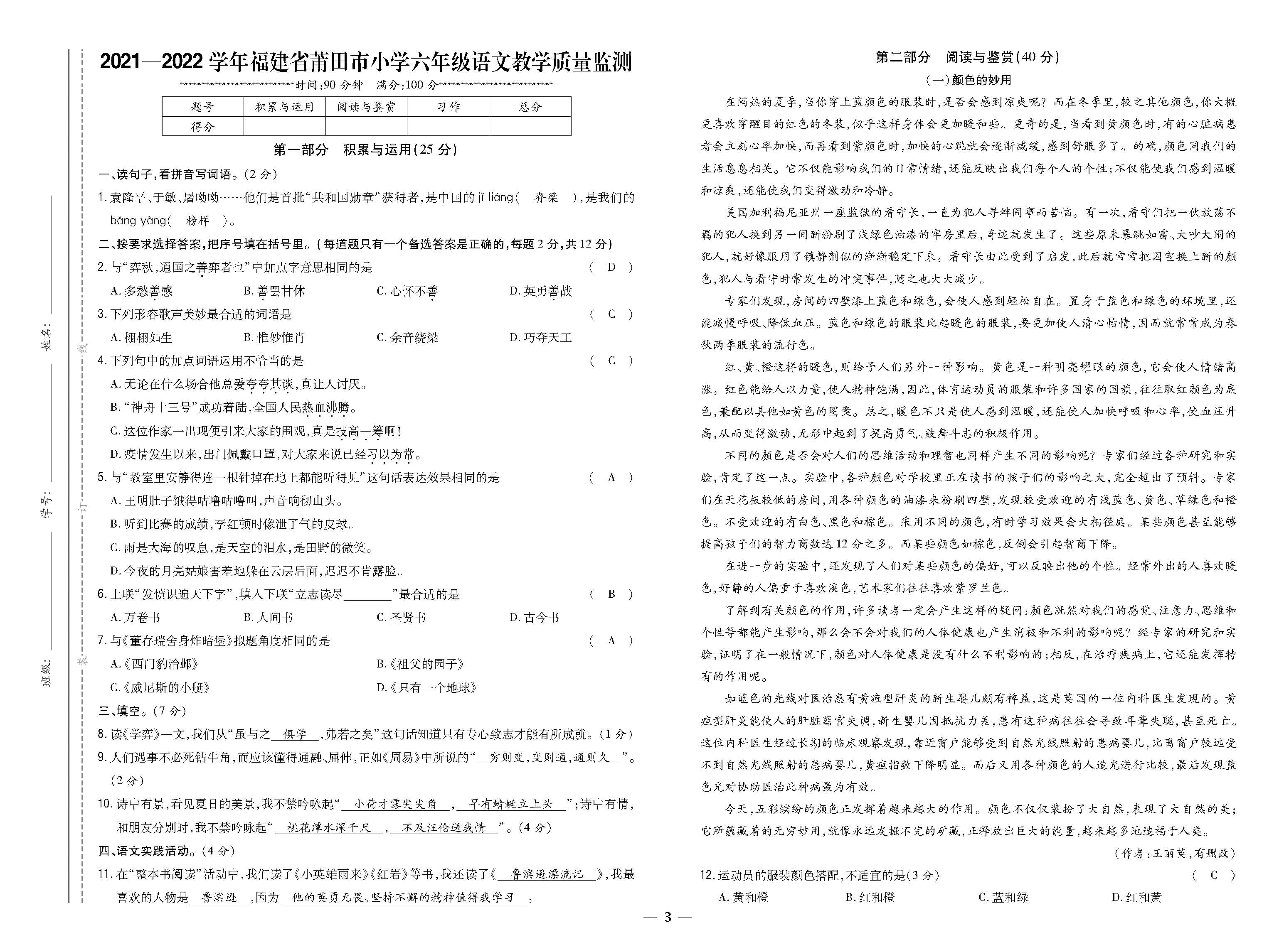 福建省莆田市2021-2022学年小学六年级教学质量监测221118