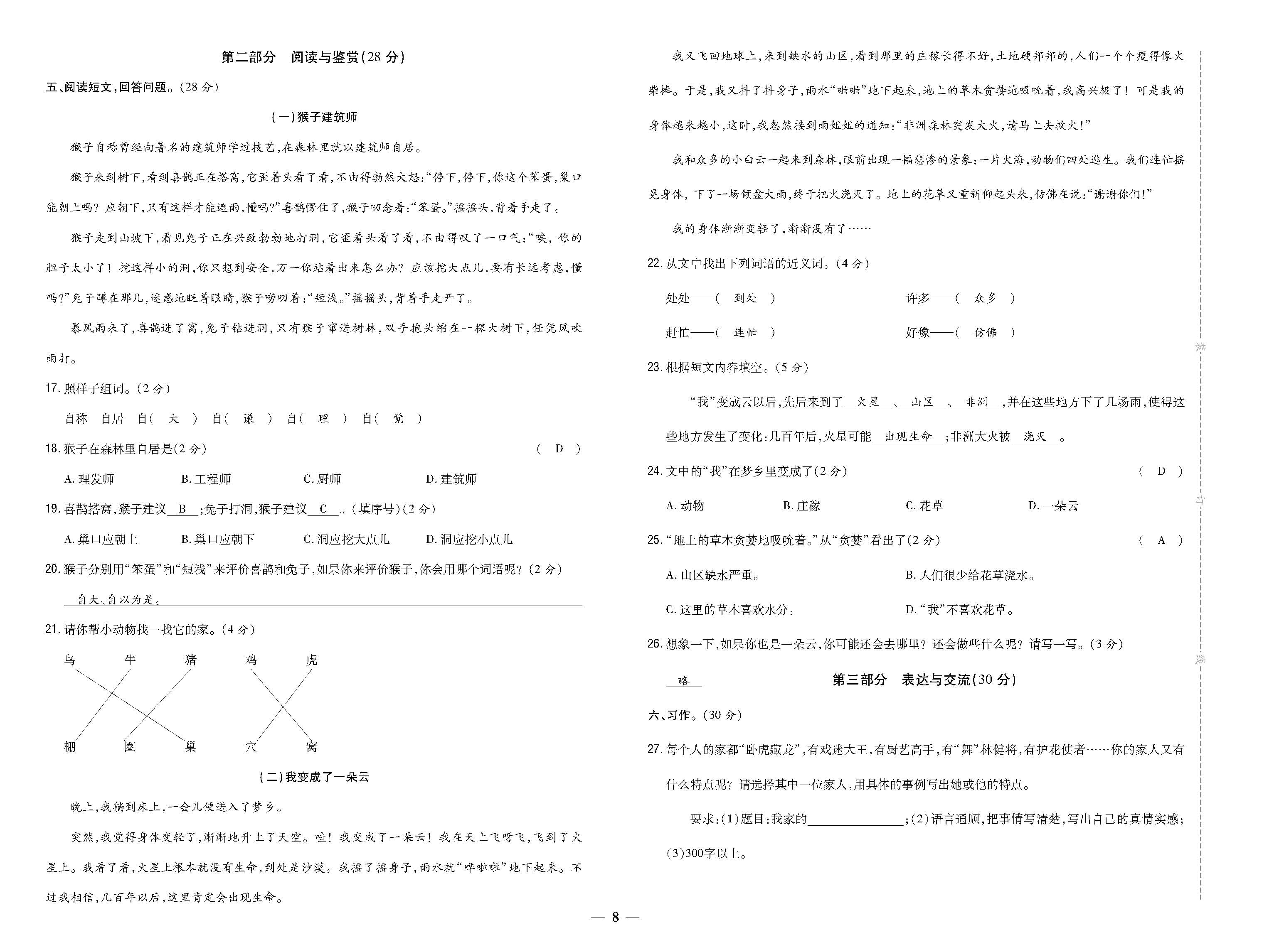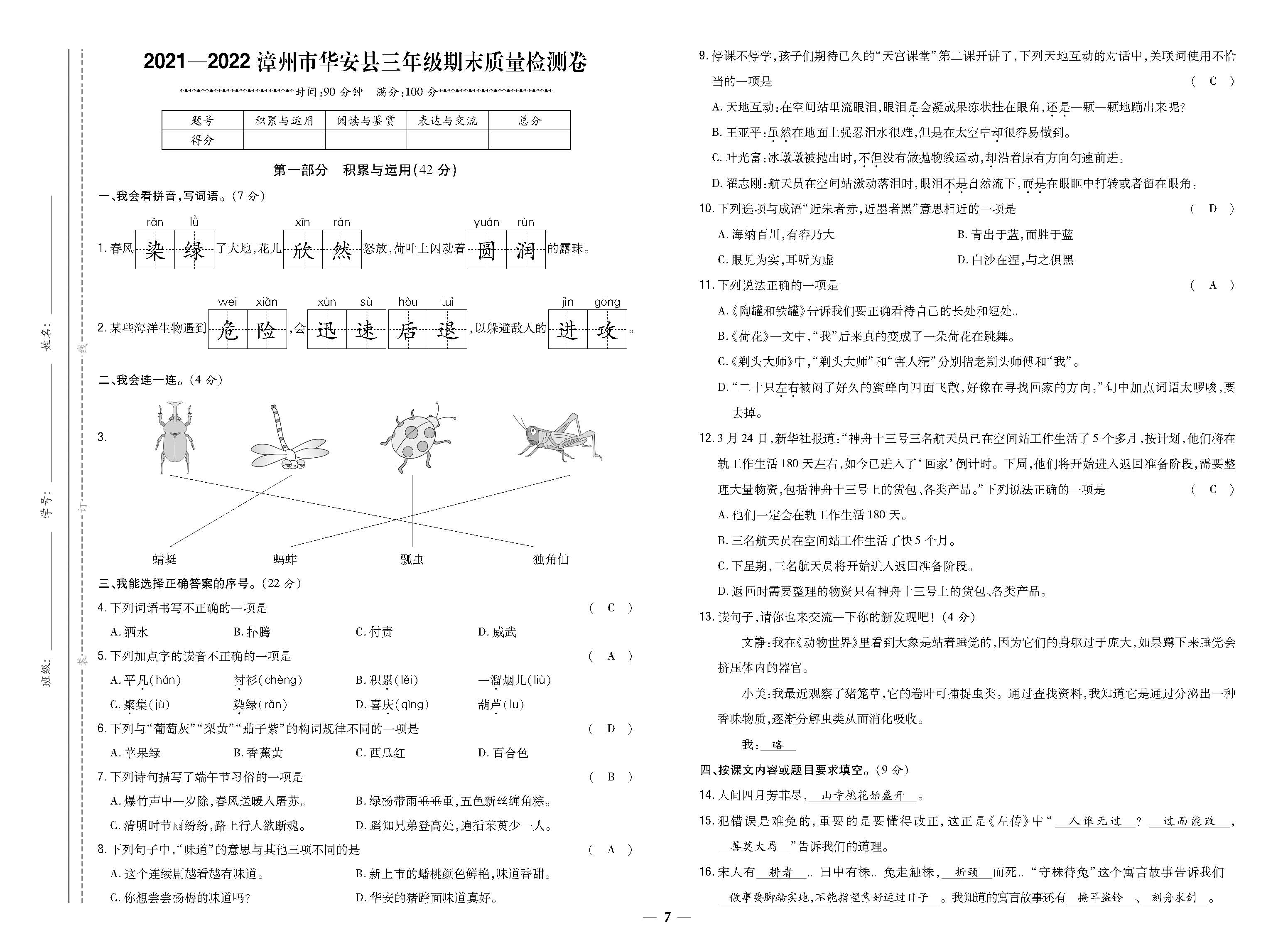 2021-2022漳州市华安县三年级期末质量检测卷221118
