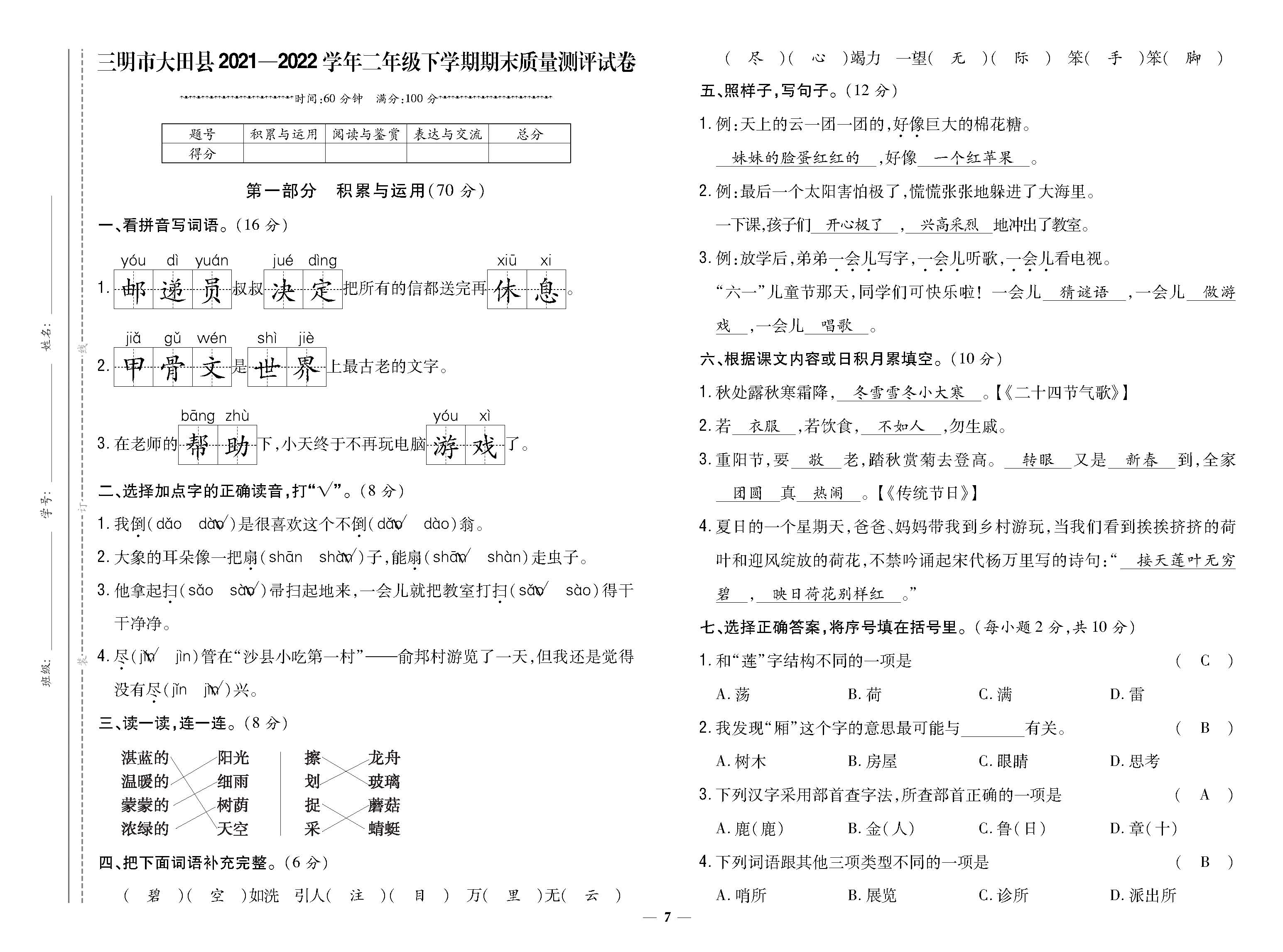 三明市大田县2021-2022学年二年级下学期期末质量测评试卷221118